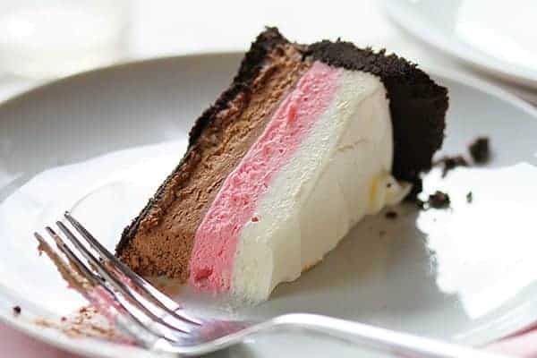 I just love how this looks… with the deep dark chocolate crust and then chocolate cheesecake, then strawberry cheesecake, then the sweet vanilla cheesecake. It’s a Neapolitan and Cheesecake lovers dream!
